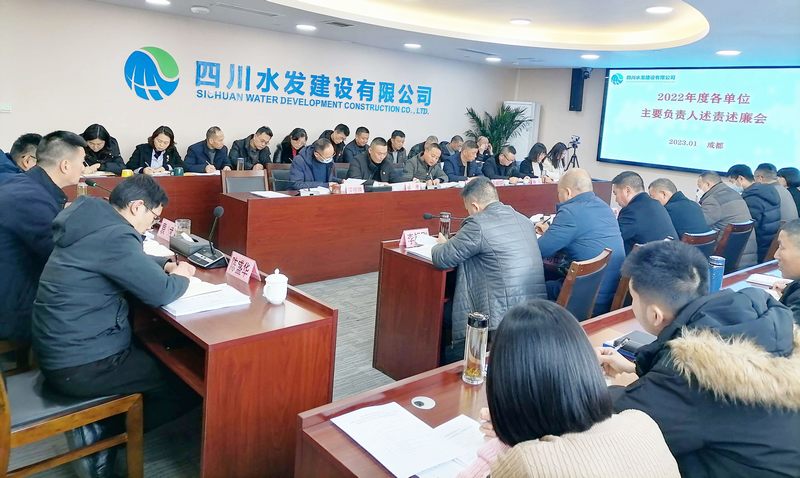 2023年1月18日,建設公司召開2022年度各單位主要負責人述責述廉會議,公司黨委專職副書記唐驚濤主持,公司黨委書記、董事長袁斌講話,公司領導班子成員、公司各黨支部書記、副書記,各單位(包括總部各部門、各分公司、各下屬企業)主要負責人、職工代表近50人參會。