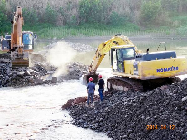 正午時分,整個工地機械轟鳴,6臺挖掘機、4臺裝載機、6輛20t自卸汽車往來穿梭,抓緊進行圍堰填筑。隨著兩岸戧堤的逐步進占,河道由寬變窄,最后形成一個寬約3米的龍口,往日平靜的涪江現(xiàn)在卻白浪翻滾,咆哮著奔出龍口。由于上游電站泄洪,導致河水水位陡增,用于截流的大塊石瞬間被沖出裹頭,最后3米的龍口始終無法合龍。面對前期準備的截流材料用盡,現(xiàn)場附近又沒有大塊石材的急情,四處領導果斷采取措施,命令截流施工人員將鋼橋板投入江中用于擋水截流,挖掘機不斷地向橋板上游投入石料。至晚上8時,二期圍堰終于順利合龍。
