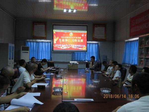2018年6月14日下午,按照川水電安全監(jiān)督[2018]5號(hào)、川水電安辦[2018]6號(hào)文件精神,金堂盤龍寺攔河閘項(xiàng)目部組織全體管理人員、配屬作業(yè)隊(duì)負(fù)責(zé)人、生產(chǎn)班組成員召開安全生產(chǎn)月活動(dòng)及學(xué)習(xí)培訓(xùn)。