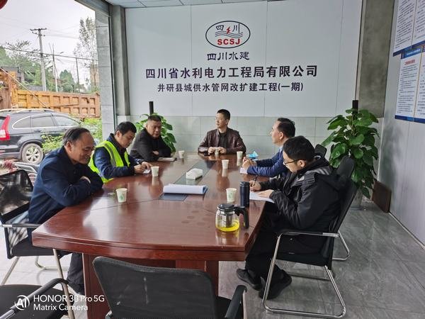 在第四分公司副經理兼項目現場負責人唐劉軍、技術負責人張君寶的陪同下,尹曉東一行首先到工地現場查看了目前項目的施工進展情況。在項目部會議室,唐劉軍和井研縣興業供水公司常務副總經理夏兵匯報了井研供水工程前期施工開展情況和目前施工進度,項目目前存在的征地協調、管材供應問題及后續施工安排等情況。