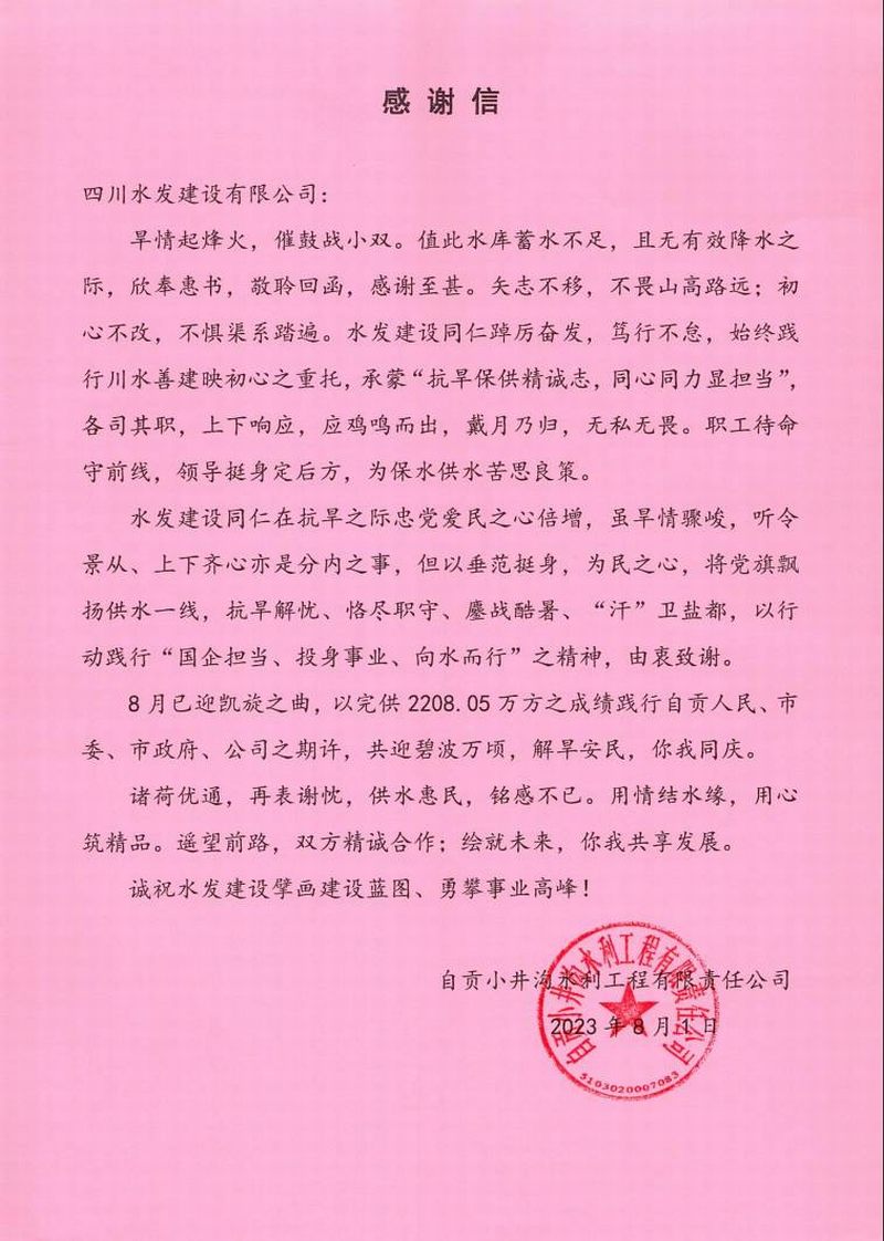 自貢小井溝水利工程有限責任公司致四川水發建設有限公司感謝信