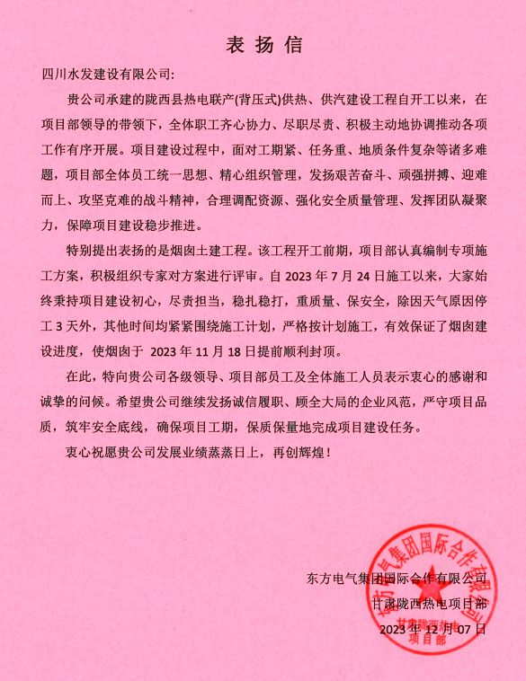 2023年12月7日,東方電氣集團(tuán)國際合作有限公司致信四川水發(fā)建設(shè)有限公司,就公司隴西縣熱電聯(lián)產(chǎn)(背壓式)供熱、供汽建設(shè)工程項(xiàng)目,特別是作為主體工程的煙囪提前三天順利封頂表示感謝。