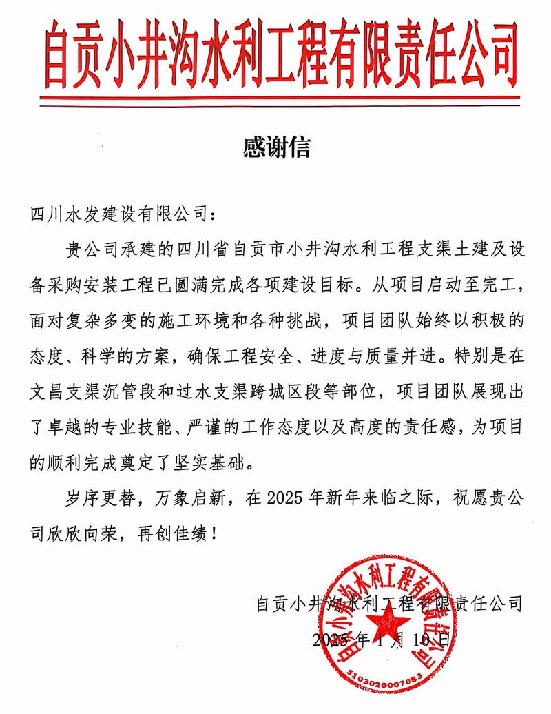 2025年1月10日,自貢小井溝水利工程有限責任公司致信四川水發建設有限公司,就公司承建的四川省自貢市小井溝水利工程支渠土建及設備采購安裝工程圓滿完成各項建設目標表示衷心感謝。
