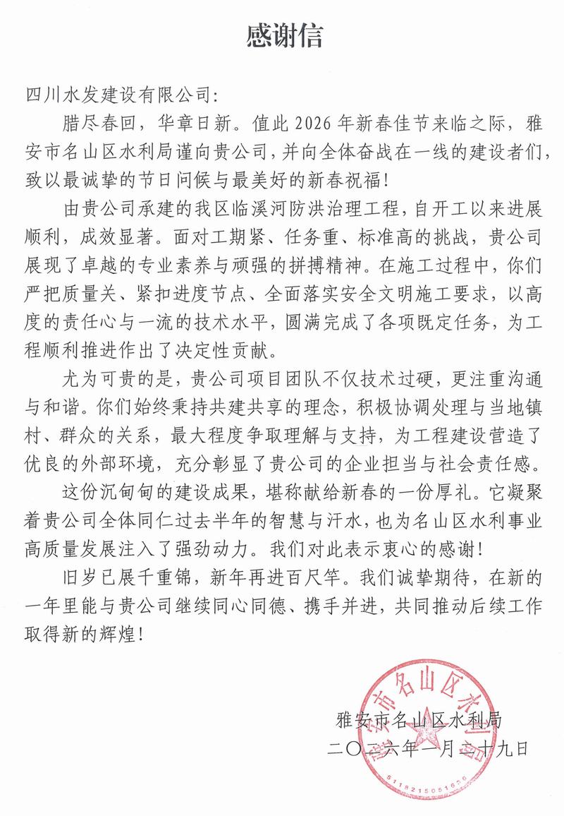 近日,公司收到來自雅安市名山區(qū)水利局的感謝信。信中對公司承建的臨溪河防洪治理工程給予高度評價,并向公司及全體一線建設(shè)者致以誠摯的新春問候與美好祝福。